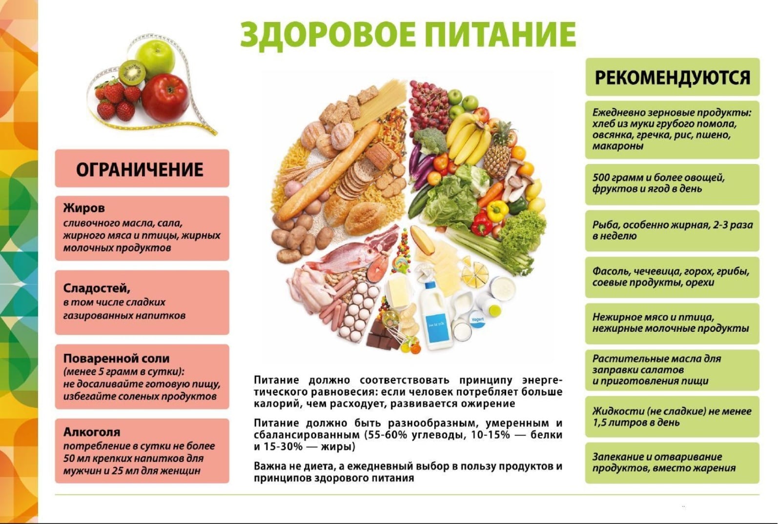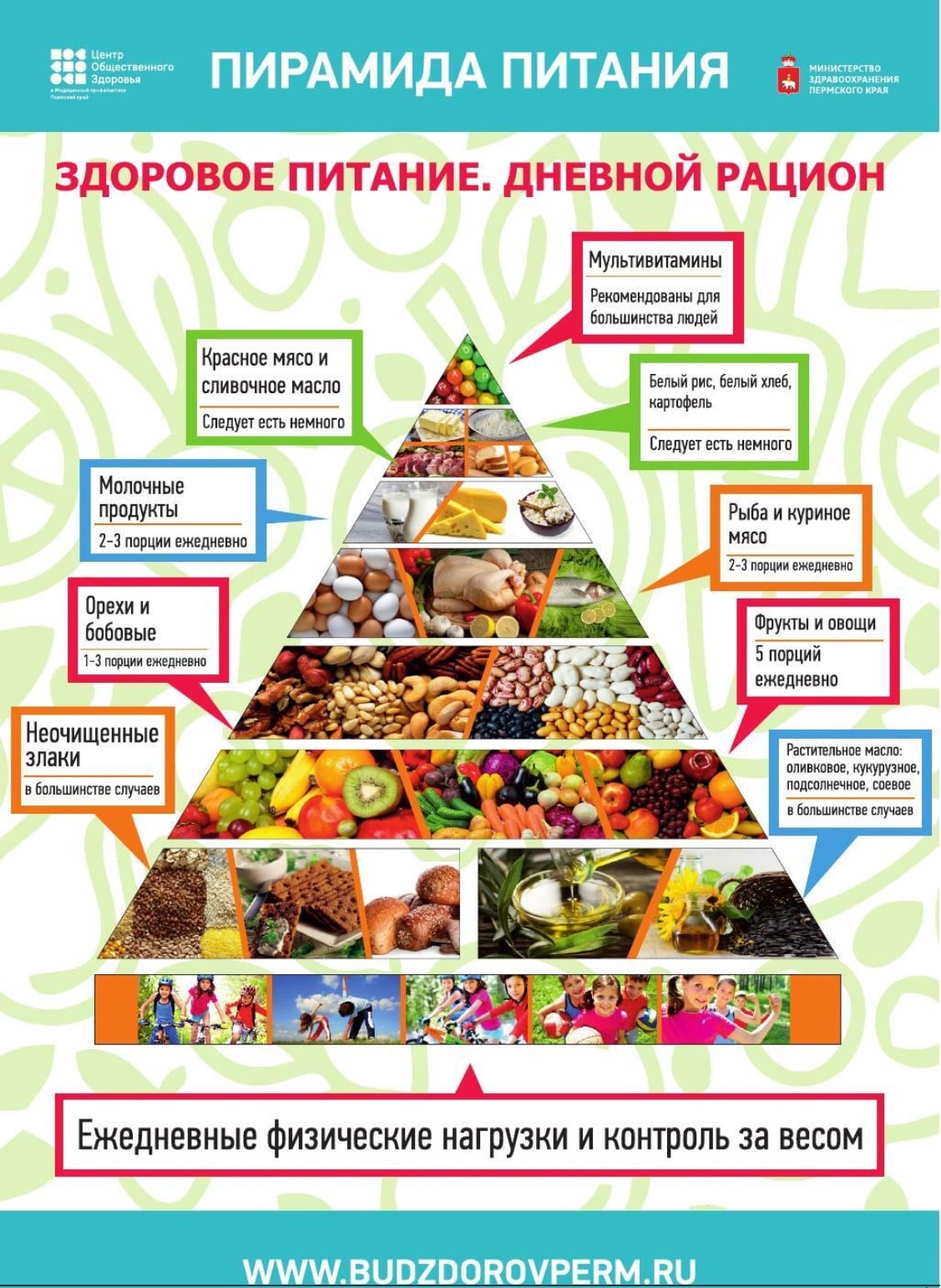 «Одним из принципов рационального питания является сбалансированность. Принципы сбалансированного питания лучше всего показаны на пирамиде питания. В основе пирамиды – зерновые продукты и хлеб, далее идут овощи и фрукты. Самый минимум – сладости и дополнительные жиры».